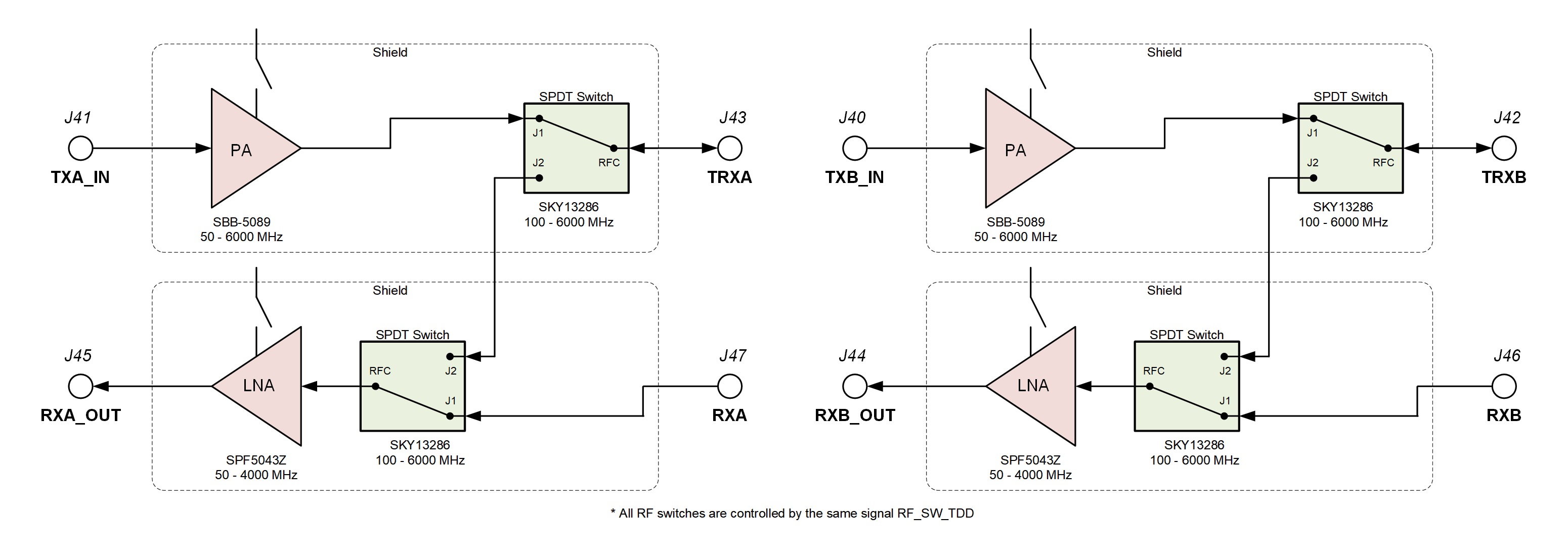 LNAs, PAs, RF switches, power and mode control (TDD and FDD)