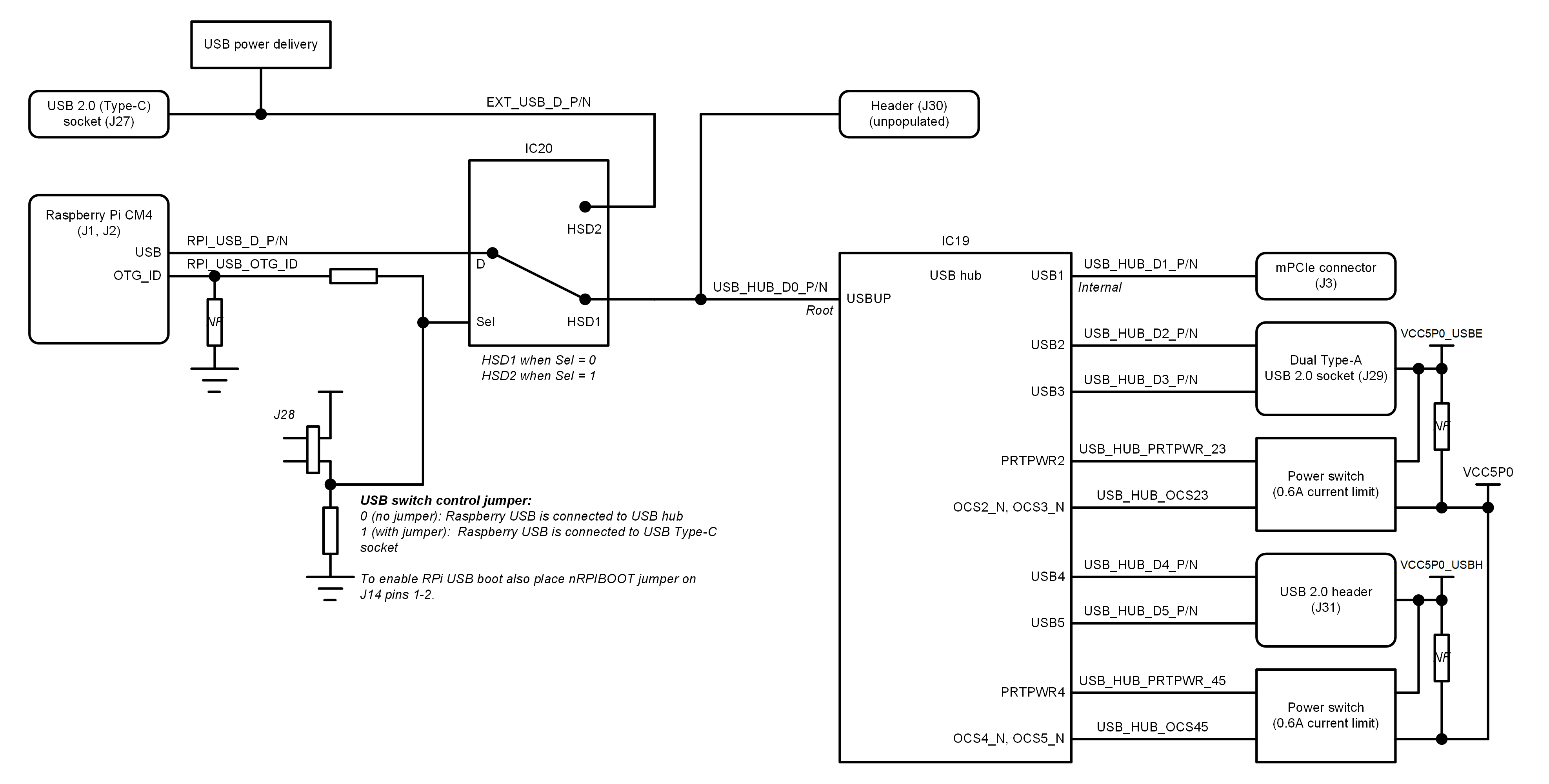 LimePSB RPCM board features 2 vertically mounted full-size HDMI 2.0 connectors (J12 and J13). Data signals are directly connected between Raspberry Pi CM4 TMDS interfaces and HDMI connectors. 5V power for HDMI connectors is supplied via a current-limited switch (IC7).