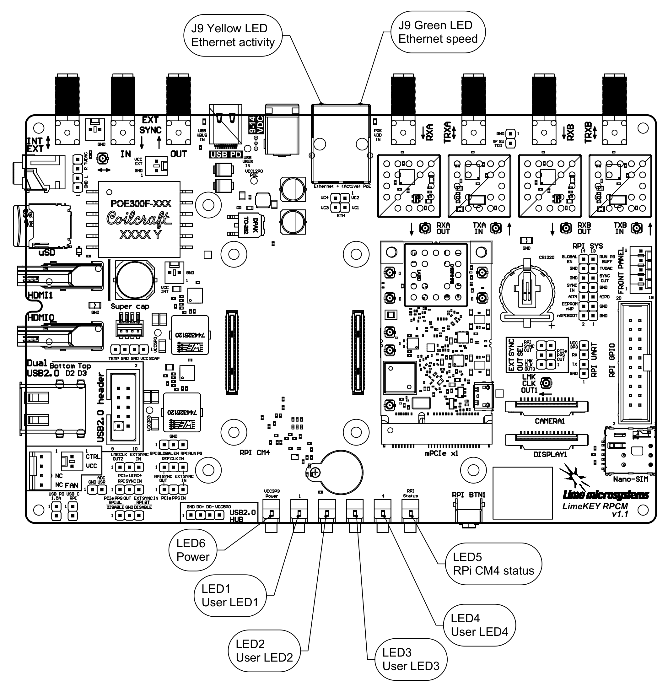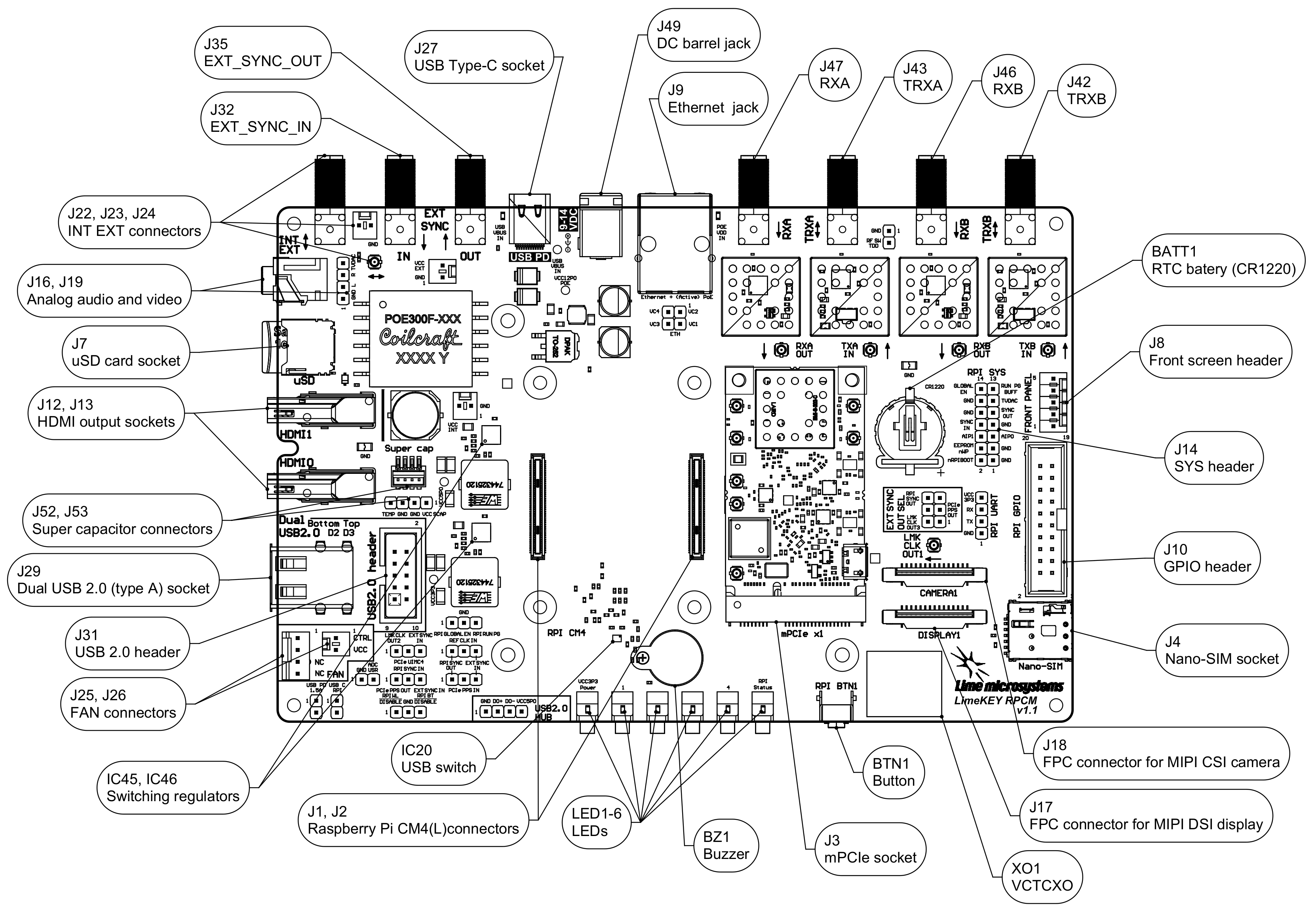 Figure 4: LimePSB RPCM v1.1 board top connectors and main components