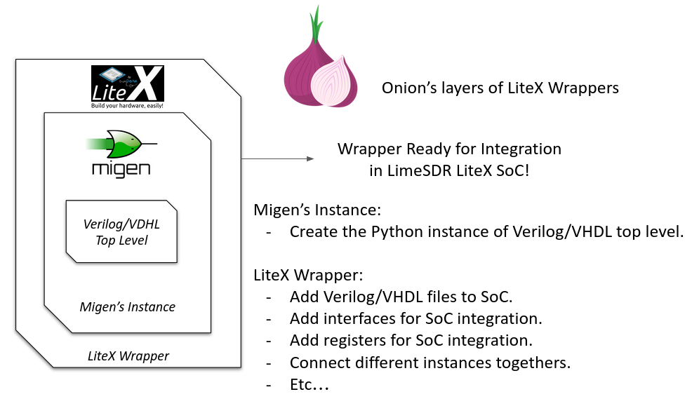 LiteX Wrapper onion layers :): At the core is the Verilog/VHDL Top Level module (e.g., a LimeDFB block). It is first instantiated using Migen to create a Python instance of the HDL top level. The LiteX wrapper then adds portability features, such as Verilog/VHDL file inclusion in the SoC, IO connections/stream interfaces, CSR registers for firmware control, and connections to different SoC instances. This modular layering ensures seamless integration and reuse across FPGA vendors and designs.
