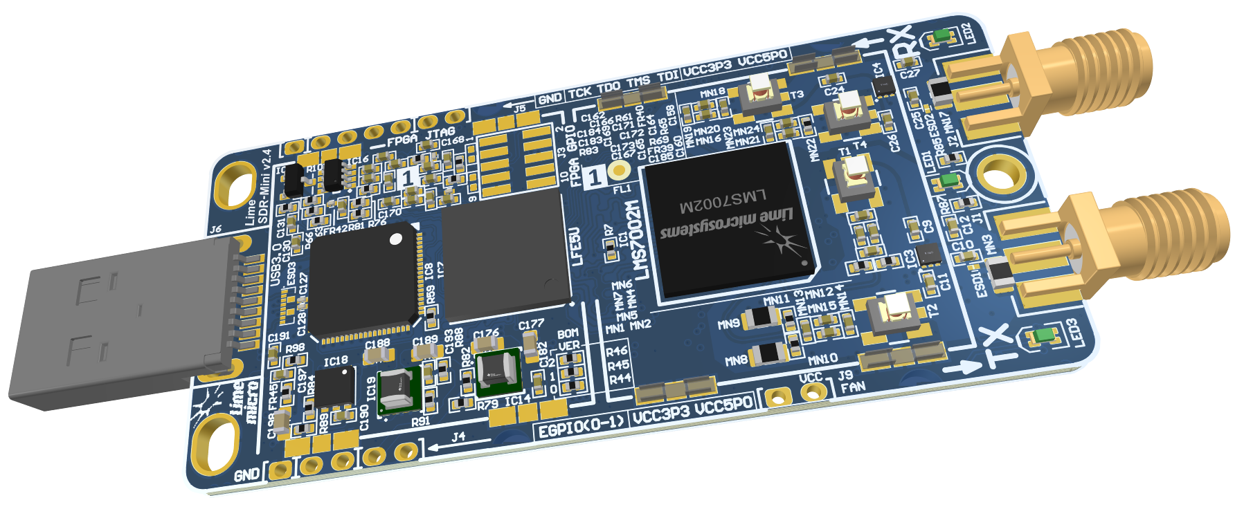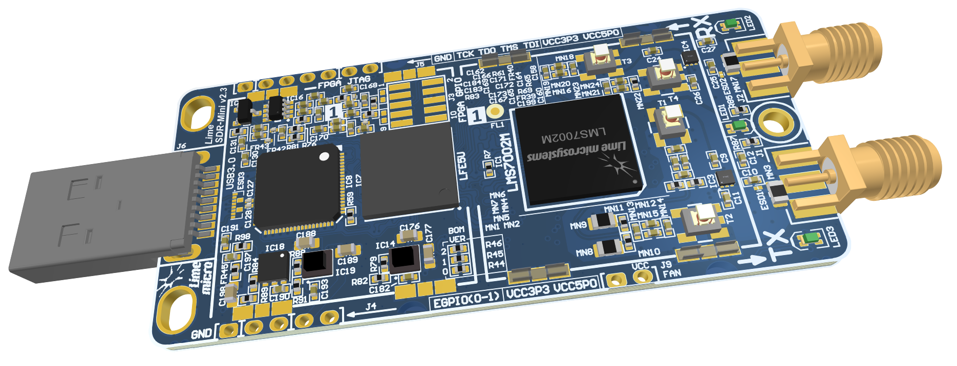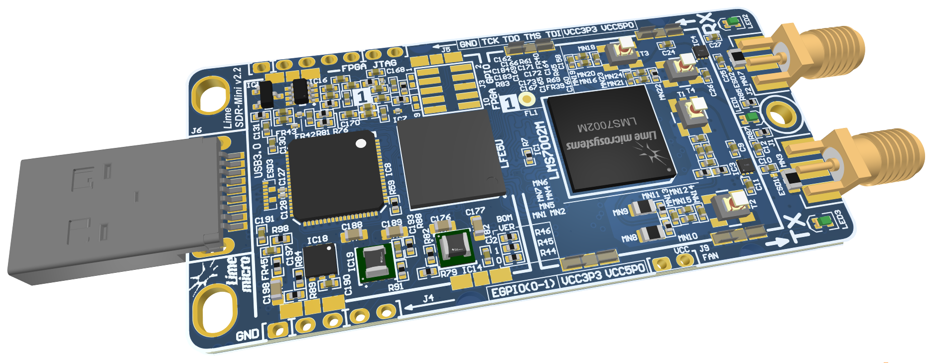 LimeSDR Mini is low-cost software defined radio board. LimeSDR Mini development board provides a hardware platform for developing and prototyping high-performance and logic-intensive digital and RF designs based on Lattice Semiconductor’s ECP5 FPGA and Lime Microsystems transceiver.