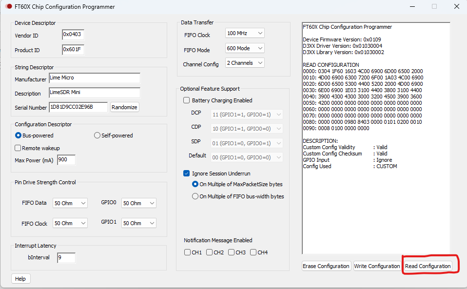 Download FT600ChipConfigurationProgUtility_v1.3.0.2.zip , connect board and hit “Read Configuration” (make sure that any other software is closed and is not using the board). You should see following settings: