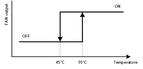 Fan will be turned on if board will heat up to 55°C and FAN will be turned off if board will cool down to 45°C.