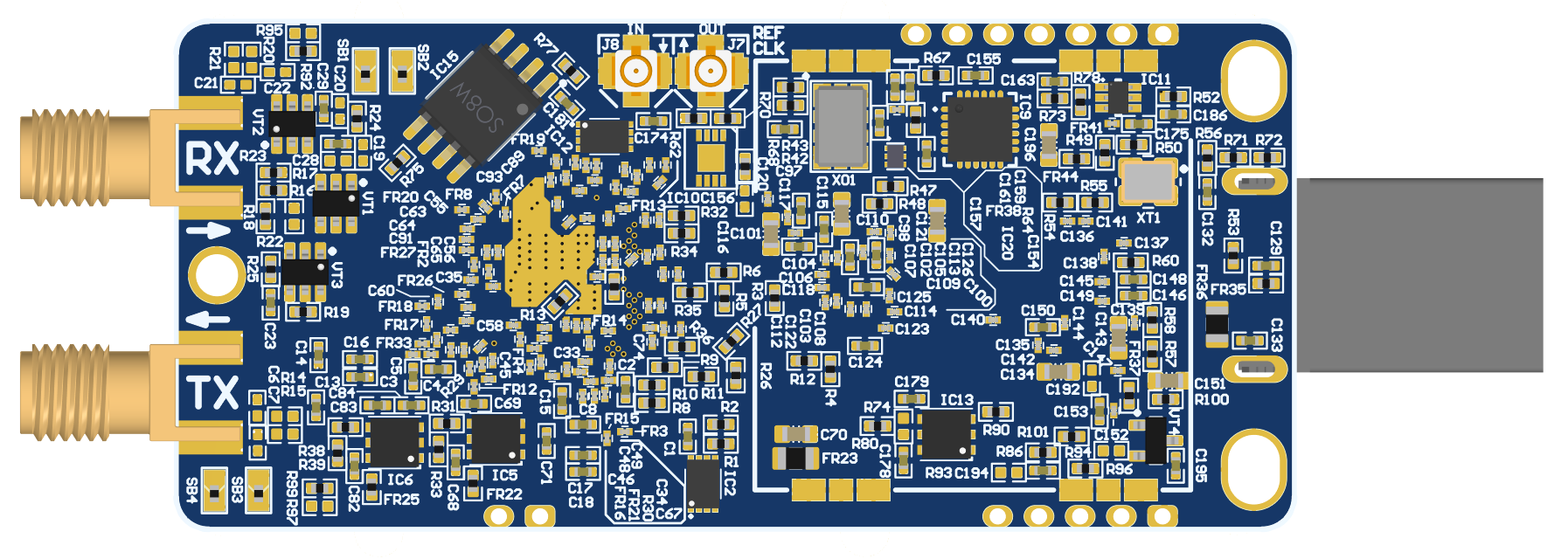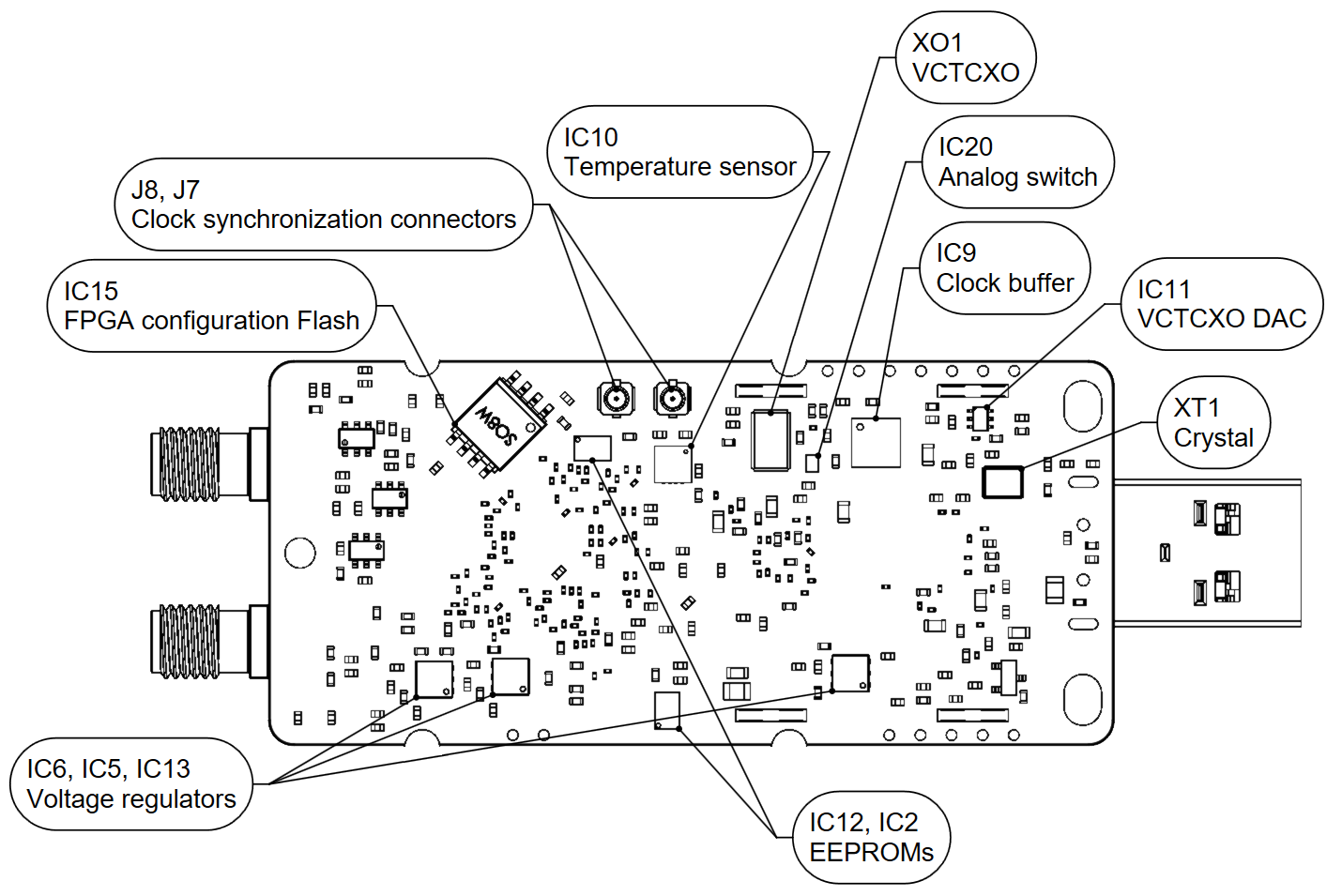 VCTCXO clock and external reference clock connector J8 (REF_CLK_IN) are connected to analog switch for clock source selection. Selected clock source is fed to clock buffer IC9. Buffered clock is connected to RF transceiver and FPGA. Buffered clock is also connected to connector J7 (REF_CLK_OUT) and can be fed to external hardware for synchronisation.