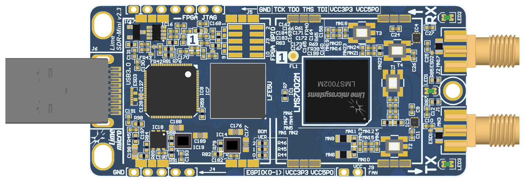 The LimeSDR-Mini is low-cost software defined radio board. LimeSDR-Mini development board provides a hardware platform for developing and prototyping high-performance and logic-intensive digital and RF designs based on Lattice Semiconductor’s ECP5 FPGA and Lime Microsystems transceiver