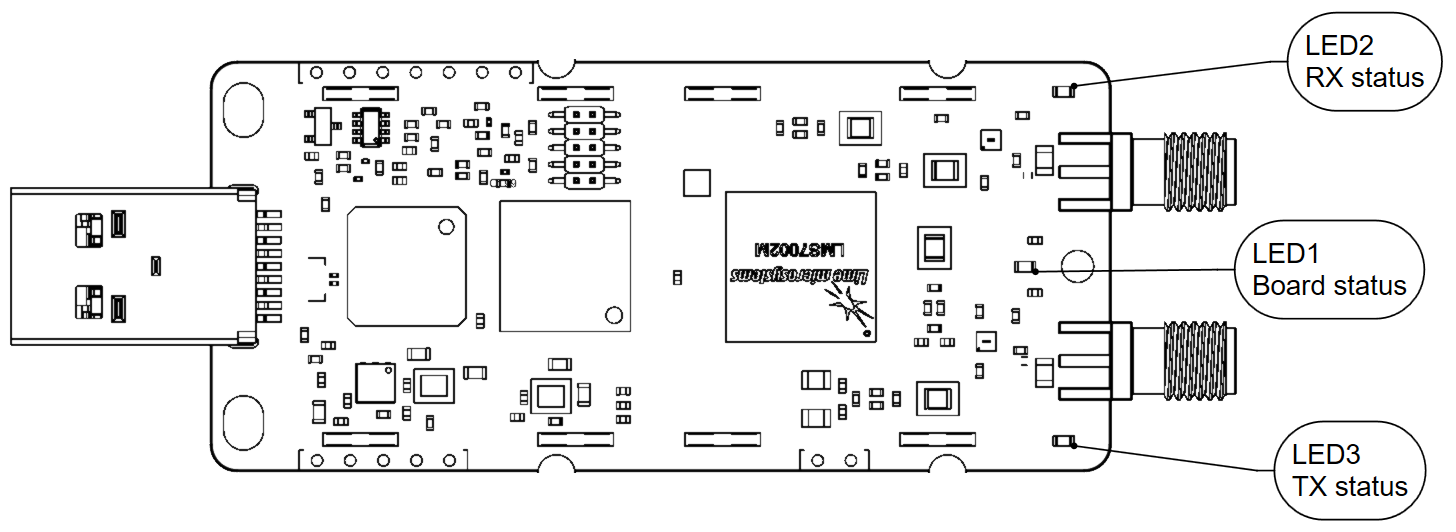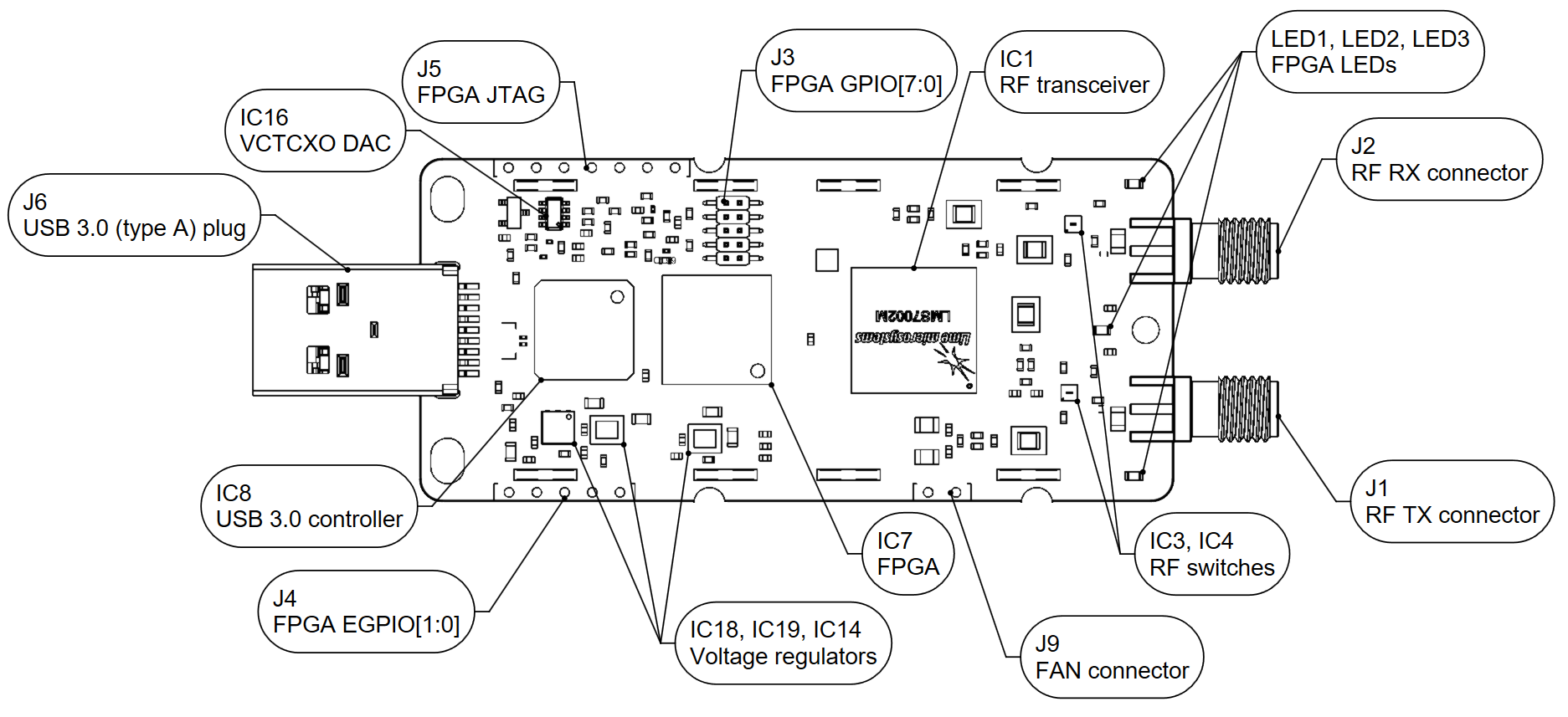 Figure 4: LimeSDR Mini v2.3 board top connectors and main components