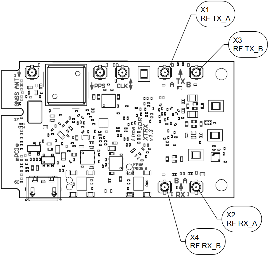 Figure 3: LimeSDR XTRX v1.3 board top with RF connector positions